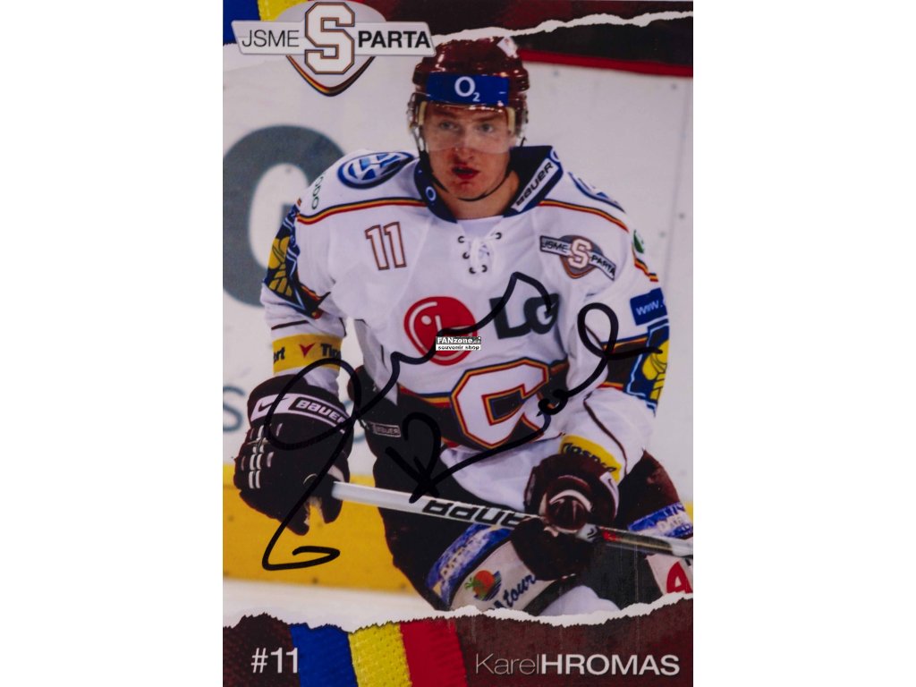Original colour photograph of hockey player Karel Hromas with number 11 in HC Sparta Prague jersey. Valuable collector's piece has authentic signature of the player in marker. The photograph depicts a prominent forward of the Prague club, who contributed significantly to Sparta's success in Czech hockey. A collector's item in perfect condition, ideal for fans and collectors of hockey memorabilia.