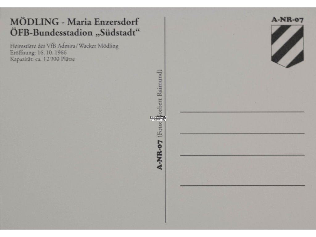 Postcard of the Austrian football stadium OFB Bundesstadion Südstadt in the city of Mödling. This is an unposted postcard in original condition – without postal mark, unaddressed and without stamp. This is an authentic collectible piece for all lovers of football and Austrian stadiums. The postcard captures the historic appearance of OFB Bundesstadion Südstadt, a prestigious Austrian football stadium. Mödling is a city in Lower Austria near Vienna. OFB Bundesstadion Südstadt is a stadium managed by the Austrian Football Association (Österreichischer Fußball-Bund). Südstadt (South City) designates the location of the stadium in the city district. The stadium represents an important part of Austrian football infrastructure and cultural heritage. Catalog number A-NR-07 documents the provenance of the postcard and its position in the systematic collection of Austrian stadiums. The original photographic postcard documents the authentic appearance of this stadium. The postcard represents a visual record of the architectural style and sports infrastructure. The postcard's original condition places it among the rarer pieces in collections of Austrian stadiums. Ideal for football stadium collectors, historians of football and lovers of Austrian sports culture. An exceptional commemorative item with historical and collectible value