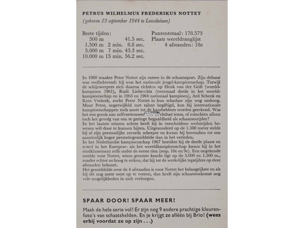 An authentic autograph card of Dutch speed skater Peter Nottet. The card is personally signed and features description of athletic data and his achievements in speed skating on the reverse. Peter Nottet is among notable Dutch speed skaters. Holland has a rich tradition in speed skating. A signed autograph card is a valuable collectible piece. The reverse with description and results increases documentary value. Ideal for collectors of sports memorabilia and skating historians.