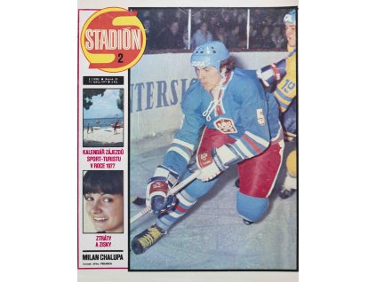 Časopis STADION, ročník XXVII, 11. I. 1977, č. 2 (1228). Milan Chalupa na titulní straně, Ingrid Holkovičová na zadní. Počet stran: 32
