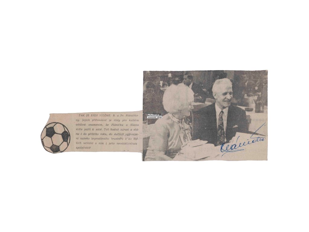 Autentický autogram československého fotbalového velkomistra František Plánički na výstřižku z novin. Výstřižek obsahuje článek či zprávu s názvem B. a F. Pláničkovy - Slavia stále patří k sobě a je vlastnoručně podepsán legendou československého fotbalu. Autogram je proveden propiskou, což dokumentuje autentičnost a přímou participaci Plánički. František Plánička patří mezi všechny doby československe fotbalu a je považován za jednoho z největších brankářů Evropy. Plánička se proslavil mimořádnými výkony v dresnu SK Slavia a československé reprezentace. Jeho dlouhá kariéra a celoživotní příslušnost ke Slavii dokumentují hluboký vztah mezi hráčem a klubem. Výstřižek z novin s odkazem na Pláničkovo spojení se Slavií je cenným artefaktem této vztahu. Autogram na novinové výstřižce je jedním z nejcennějších typů fotbalových memorabilií. Podpis propiskou na papíru dokumentuje autentičnost a přímý kontakt s legendou. Ideální kousek pro sběratele československých fotbalových suvenýrů, historiků fotbalu a milovníky SK Slavia. Cenný pamětní předmět s neocenitelenou historickou a sbíratelskou hodnotou. Výjimečný artefakt spojující novinový záznam s osobním autogramem legend