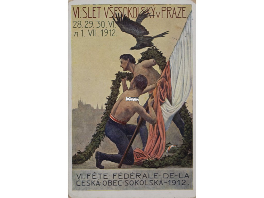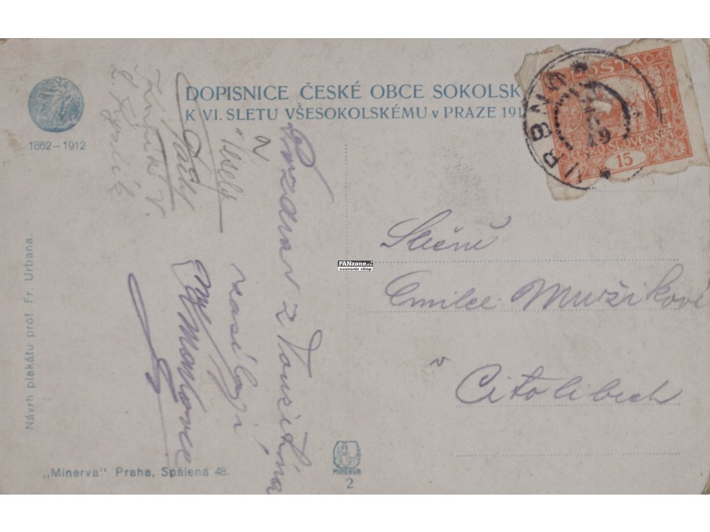 Autentická historická dopisnice k VI. sletu všesokolskému v Praze z března 1912. Jedná se o vzácný dokument z období největšího rozkvětu československého sokolského hnutí. Dopisnice je nadepsaná, nese poštovní známku a razítko, což dokumentuje její autentické používání jako poštovní zásilky. Všesokolský slet představoval vrcholnou událost sokolského hnutí, kde se sešli tisíce účastníků z celého československého území. VI. slet v Praze roku 1912 byl jednou z nejpomáhavějších akcí této doby a představoval apogej sokolské organizace v období před první světovou válkou. Dopisnice zachycuje atmosféru této historicky významné události. Nadepsání a využití jako poštovní zásilka zvyšují její autentičnost a historickou hodnotu. Ideální kousek pro sběratele československých souvenýrů, historiků Sokolu a milovníky československé kulturní historie. Výjimečný pamětní předmět z počátku 20. století s neocenitelenou historickou a sbíratelskou hodnotou