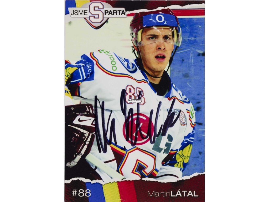 Fotografie - kartička českého hokejisty Martina Látala s číslem 88 z HC Sparta Praha. Kartička je součástí edice Jsme Sparta vydávané HC Sparta. Kartička obsahuje fotografii a údaje o hráči. Martin Látal je českým hokejistou reprezentujícím prestižní klub Sparta Praha. Číslo 88 je jeho herní číslo. Kartička nese autogram podepsaný fixem přímo na snímku. Autogram zvyšuje autenticitu a sbíratelskou hodnotu. Edice Jsme Sparta patří k populárním sběratelským kartám. Ideální kousek pro sběratele českých hokejových karet. Cenný pamětní předmět dokumentující české hokejisty.
