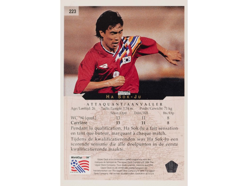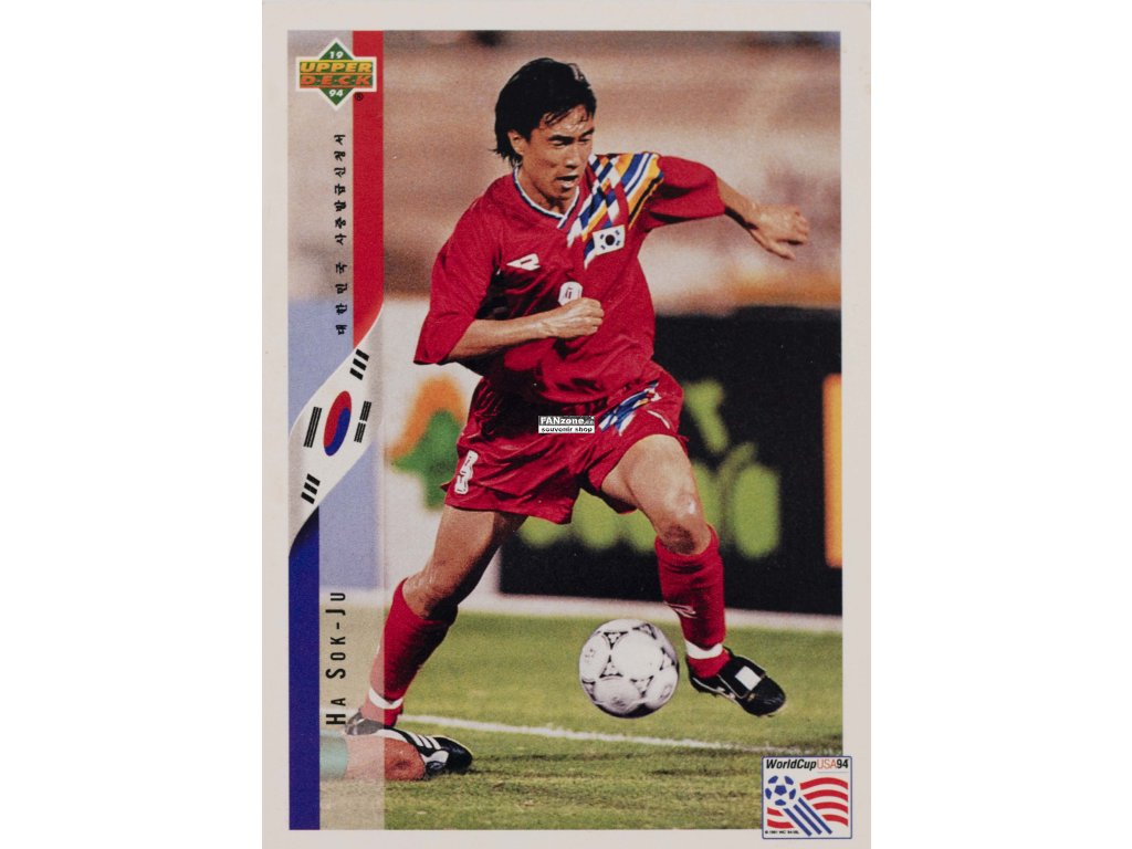 Autentická fotbalová kartička japonského hráče Ha-Sok-Ju z roku 1994. Jedná se o originální sběratelský kousek s číslem katalogu 223 vydaný v souvislosti s Mistrovstvím světa v kopané USA 1994. Kartička dokumentuje účast japonského fotbalisty v jedné z největších fotbalových akcí na světě. World Cup USA 1994 bylo prestižním Mistrovstvím světa v kopané, které se konalo v Spojených státech a přitahlo celosvětový zájem. Japonsko se aktivně účastnilo tohoto turnaje a reprezentovalo asijský fotbal na globální scéně. Ha-Sok-Ju byl japonským fotbalistou reprezentujícím svou zemi v této historické soutěži. Kartičky fotbalistů z Mistrovství světa jsou vysoce ceňovanými sbíratelskými kousky a představují důležité dokumenty fotbalové historie. Číslo 223 dokumentuje pozici hráče v systematické sbírce všech účastníků turnaje. Originální kartička z roku 1994 je autentickým artefaktem období, kdy fotbal získával rostoucí popularitu v Asii. Ideální kousek pro sběratele světových fotbalových suvenýrů, historiků fotbalu a milovníky Mistrovství světa. Cenný pamětní předmět dokumentující asijský fotbal a světové turnaje. Výjimečný artefakt z jednoho z největších fotbalových podniků v historii.
