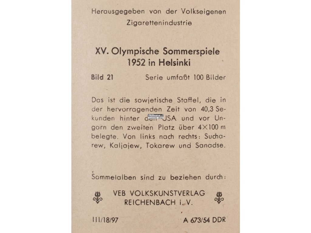Originální sběratelská kartička ze série Olympia 1952 věnované Olympijským hrám v Helsinkách. Kartička číslo 76 zobrazuje legendárního maďarského šermíře Aladar Gereviche, sedminásobného olympijského vítěze. Tento vzácný sběratelský předmět je součástí limitované série 100 obrázků dokumentujících významné sportovce a momenty helsinské olympiády. Cenný dokument olympijské historie v původním stavu.