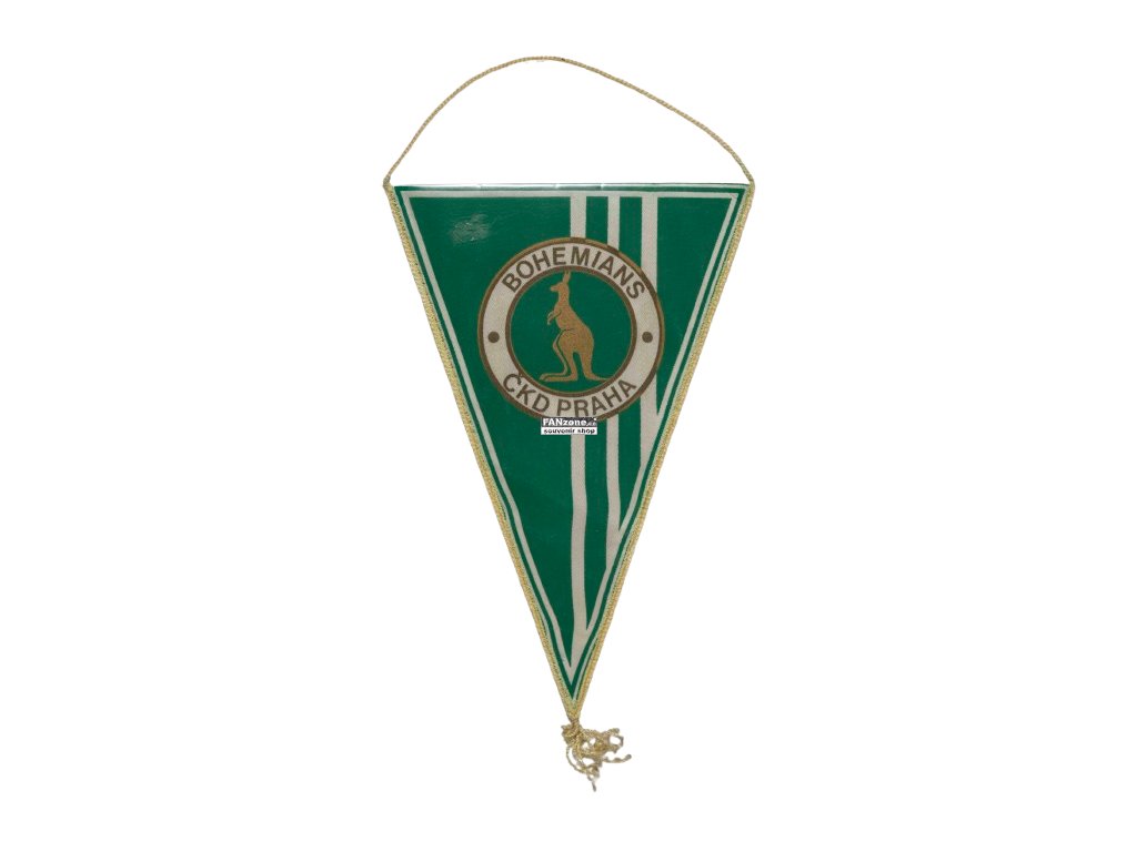 Originální klubová vlajka Bohemians ČKD Praha, vyrobená z textilu s tiskem a ochrannou fólií, jednostranný design. Bohemians Praha, přezdívaní "Klokani" pro své zelenobílé barvy, patří mezi nejstarší české fotbalové kluby založené v roce 1905. Označení "ČKD" odkazuje na Českomoravskou Kolben-Daněk, významný strojírenský podnik, který klub sponzoroval v socialistickém období. Bohemians ČKD byl název klubu používaný přibližně v letech 1950-1993, kdy klub byl spojen s tímto průmyslovým podnikem. Klub má bohatou historii, včetně mistrovských titulů a silné mládežnické akademie. Bohemians tradičně hrají na Ďolíčku, jednom z nejstarších českých fotbalových stadionů. Jednostranný tisk s ochrannou fólií zajišťuje kvalitní zpracování vlajky. Vzácná memorabilie pro sběratele fotbalových suvenýrů, fanoušky Bohemians Praha nebo milovníky "Klokanů" a československého fotbalu socialistického období.