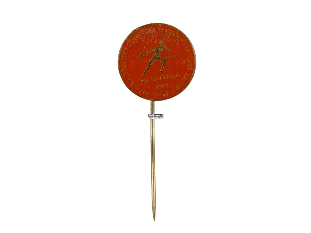 Pamětní modrý odznak z mezinárodních mistrovství ČSSR ve stolním tenisu v Prievidzi v roce 1983, vyrobený ze smaltu a žlutého kovu s jehlou připájenou kolmo a ohnutou o 90°. Prievidza je město na středním Slovensku s přibližně 45 000 obyvateli, významné průmyslové centrum. Rok 1983 spadá do období socialistického Československa, kdy se konaly významné mezinárodní sportovní turnaje. Stolní tenis měl v Československu silnou tradici a ČSSR patřilo mezi evropskou špičku. Mezinárodní mistrovství přitahovala špičkové hráče ze socialistických zemí i ze Západu. Odznak je vyroben tradiční technikou smaltu na žlutém kovu, modrá barva je dominantním prvkem. Jehla připájená kolmo a ohnutá o 90° je typickou konstrukcí pro odznaky z této éry. Prievidza měla kvalitní sportovní zařízení pro organizaci mezinárodních turnajů. Vzácná memorabilie pro sběratele sportovních odznaků, fanoušky stolního tenisu nebo milovníky československého sportu osmdesátých let.