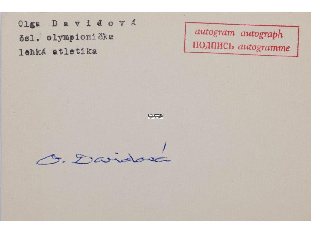 Autentická podpisová karta československé atletky Olgy Davidové. Karta je vlastnoručně podepsána propiskou, což dokumentuje autentičnost a přímou participaci sportovkyně. Olga Davidová byla významnou československou atletkou na olympijských hrách. Lehká atletika patří k základním olympijským disciplínám. Československo mělo silnou tradici v atletickém sportu. Podpisová karta s autentickým podpisem je cenným kouskem. Autentický podpis zvyšuje historickou a sbíratelskou hodnotu. Ideální pro sběratele československých olympijských suvenýrů. Cenný pamětní předmět dokumentující československou atletiku.