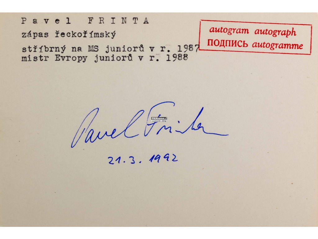Autentická podpisová karta Pavla Frinty, výjimečného československého zápasníka v řeckořímském stylu, s originálním podpisem propiskou datovaným 21. března 1992. Pavel Frinta dosáhl významných úspěchů - získal stříbrnou medaili na mistrovství Evropy juniorů v roce 1987 a zlatou medaili mistra Evropy juniorů v roce 1988. Tyto úspěchy jej řadí mezi elitní zápasníky své generace. Vzácná memorabilie pro sběratele autogramů československých sportovců, fanoušky zápasu nebo milovníky úspěšných příběhů z historie československého sportu.