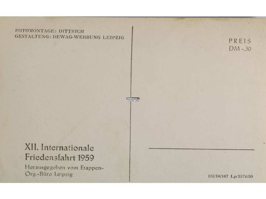 Originální pohlednice z XII. Mezinárodního závodu míru (Friedensfahrt) Berlin - Praha - Varšava z roku 1959, jednoho z nejprestižnějších cyklistických závodů socialistického bloku. Pohlednice je označena číslem 111/18/187 a cenou PREIS- DM 30. Nachází se v perfektním stavu - nenadepsaná a neprošlá poštou. Závod míru byl často nazýván "Tour de France Východu" a představoval vrchol amatérské cyklistiky v Evropě. Vzácný sběratelský kousek pro fanoušky cyklistiky, milovníky historie socialistického sportu nebo sběratele memorabilií z období studené války.