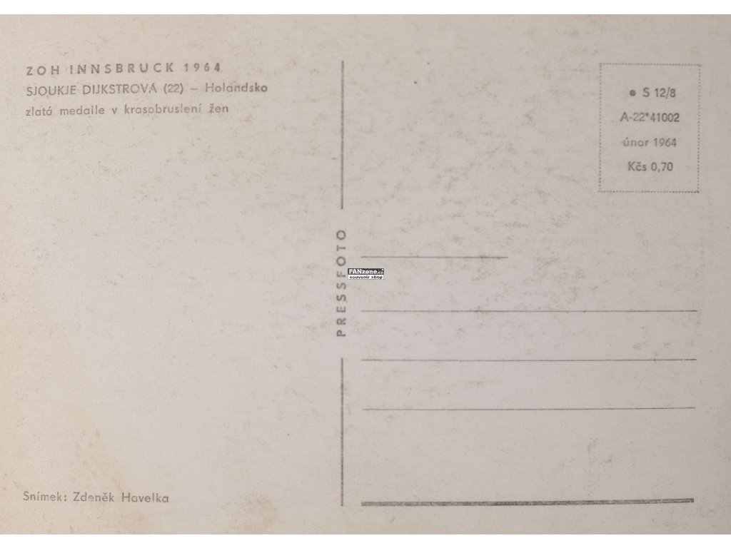 Originální portrétní pohlednice Sjoukije Dijkstra z Nizozemska ze Zimních olympijských her 1964, označená jako PRESSFOTO, na snímku od Zdeňka Havelky. Tento sběratelský kousek je v dokonalém stavu - neprošlý poštou a bez poštovní známky. Sjoukije Dijkstra byla legendární nizozemskou krasobruslařkou a zlatou medailistkou ze ZOH 1964 v Innsbrucku. Byla první nizozemskou sportovkyní, která získala zlatou olympijskou medaili v zimních sportech. Zdeněk Havelka byl renomovaným sportovním fotografem, který dokumentoval významné sportovní události. Označení PRESSFOTO dokládá profesionální původ této fotografie určené pro tiskové účely. ZOH 1964 byly významné pro krasobruslení a Dijkstra zde dominovala. Vzácná memorabilie pro sběratele olympijských pohlednic, fanoušky krasobruslení nebo milovníky olympijské historie a zimních sportů.