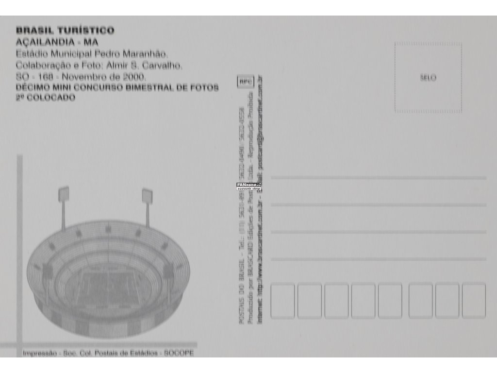 Originální pohlednice zachycující Estádio Municipal Pedro Maranhão v Açailândii ve státě Maranhão (MA), Brazílie. Tento sběratelský kousek je neprošlý poštou a bez známky, ale nadepsaný. Açailândia je město ve státě Maranhão v severovýchodní Brazílii s přibližně 110 000 obyvateli, známé těžbou a hutnictvím. Název stadionu "Pedro Maranhão" je pojmenován po významné místní osobnosti spojené s městem nebo sportom. Maranhão je jedním z nejchudších brazilských států, ale fotbal zde má velký význam pro místní komunity. I města v odlehlejších regionech jako Açailândia mají své městské stadiony, které slouží jako centra komunitního života a sportu. Brazilský fotbal je národní vášní a každý stadion, bez ohledu na velikost města, má svůj příběh. Vzácná pohlednice ideální pro sběratele stadionových memorabilií, fanoušky brazilského fotbalu nebo milovníky jihoamerické fotbalové kultury a brazilské regionální diverzity.