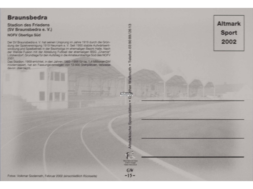 Pohlednice německého stadionu Stadion des Friedes SV Braunsbedra. Neprošlá pohlednice v původním stavu bez razítka, nadpisu a známky. Stadion des Friedes znamená Stadion míru. SV Braunsbedra je německý fotbalový klub. Braunsbedra je lokalita v německém regionu. Stadion představuje německou fotbalovou infrastrukturu. Číslo katalogu GW 15 dokumentuje provenance pohlednice. Originální fotografická pohlednice zachycuje autentickou podobu stadionu. Pohlednice představuje vizuální záznam německé sportovní kultury. Ideální pro sběratele německých stadionů a historiků fotbalu. Cenný pamětní předmět z německé sportovní historie