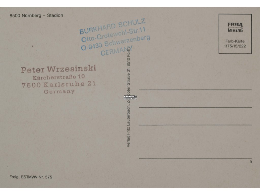 Pohlednice německého stadionu v Norimberku. Neprošlá pohlednice v původním stavu bez razítka, nadpisu a známky. Nürnberg Stadion je stadionem Norimberka. Nürnberg je historickým německým městem se silnou fotbalovou tradicí. Stadion představuje německou fotbalovou infrastrukturu. Číslo katalogu 575 dokumentuje provenance pohlednice. Originální fotografická pohlednice zachycuje autentickou podobu stadionu. Pohlednice představuje vizuální záznam německé sportovní kultury. Ideální pro sběratele německých stadionů a historiků fotbalu. Cenný pamětní předmět z německé sportovní historie.