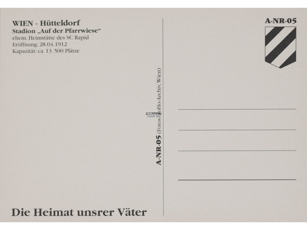 Pohlednice rakouského fotbalového stadionu SC Rapid Stadion ve Vídni v lokalitě Hütteldorf. Jedná se o neprošlou pohlednici v původním stavu – bez poštovního razítka, nenadepsanou a bez známky. Toto je autentický sběratelský kousek pro všechny milovníky fotbalu a rakouských stadionů. Pohlednice zachycuje historickou podobu SC Rapid Stadion, který je jedním z nejznámějších a nejstarších rakouských fotbalových stadionů. SC Rapid Wien patří mezi nejstarší a nejvýznamnější rakouské fotbalové kluby s dlouhou tradicí a úspěchy. Hütteldorf je vídňská lokalita, která je domovem této prestižní fotbalové instituce. Stadion představuje důležitou součást fotbalové historie Vídně a celé Rakouska. SC Rapid Stadion se vyznačuje svým historickým významem a kultovním postavením v rakouské fotbalové kultuře. Katalogové číslo A-NR-05 dokumentuje provenance pohlednice a zařazení do systematické sbírky rakouských stadionů. Originální fotografická pohlednice dokumentuje autentickou podobu tohoto stadionu z určité historické periody. Pohlednice představuje vizuální záznam architektonického stylu a sportovní infrastruktury daného období. Originální stav pohlednice ji řadí mezi vzácnější kousky ve sbírkách rakouských stadionů. Ideální pro sběratele fotbalových stadionů, historiky fotbalu a milovníky rakouské sportovní kultury.