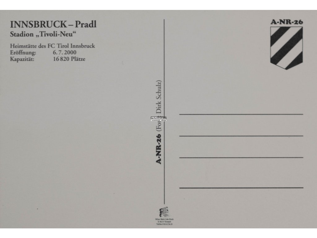 Pohlednice austriackého stadionu Tivoli Neu v Innsbrucku v lokalitě Pradl. Neprošlá pohlednice v původním stavu bez razítka, nadpisu a známky. Tivoli Neu je stadionem FC Tirol Innsbruck. Innsbruck je město se silnou sportovní tradicí. Stadion se jménem Tivoli Neu (Nový Tivoli) reprezentuje moderní austriackou sportovní infrastrukturu. Číslo katalogu A-NR-26 dokumentuje provenance pohlednice. Originální fotografická pohlednice zachycuje autentickou podobu stadionu. Ideální pro sběratele austriackých stadionů a fotbalové historiky. Cenný pamětní předmět s historickou a sbíratelskou hodnotou
