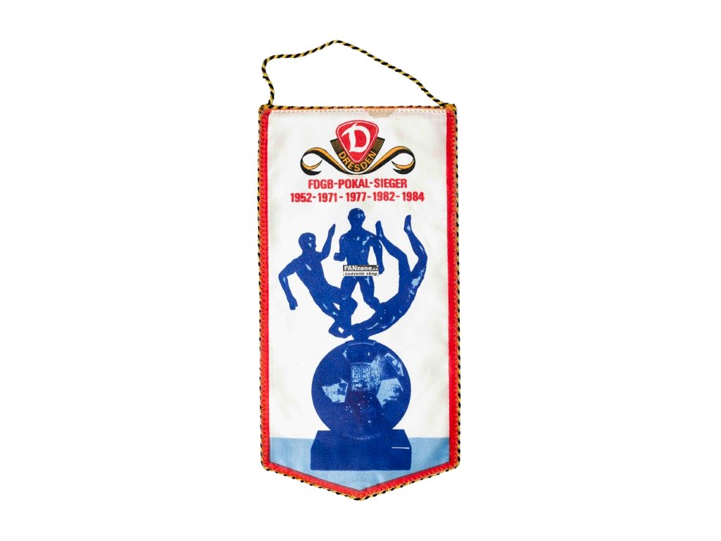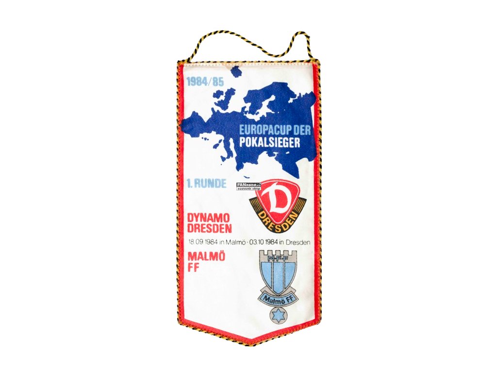 Vzácná pohárová vlajka z utkání Dynamo Dresden proti Malmö FF z evropského poháru 1984/1985, 1. kolo konané 18. září 1984 a 3. října 1984, vyrobená z textilu s oboustranným tiskem. Dynamo Dresden byl jedním z nejúspěšnějších klubů východního Německa (NDR) a jejich účast v evropských pohárech byla prestižní záležitostí. Malmö FF ze Švédska patřil mezi silné severské kluby s bohatou evropskou tradicí. Sezóna 1984/1985 byla érou rozdělené Evropy, kdy se kluby z východu a západu potkávaly v evropských soutěžích. Oboustranný tisk vlajky dokumentuje oba zápasy tohoto dvojutkání. Taková memorabilia byla vzácná už v době vzniku kvůli omezenému kontaktu mezi východem a západem. Unikátní sběratelský kousek pro fanoušky evropského fotbalu, milovníky historie NDR nebo zájemce o fotbal doby studené války.