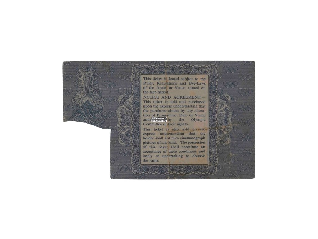 Autentická vstupní vstupenka z Olympijských her v Londýně konaných 30. června 1948. Jedná se o vstupenku na atletické závody s údaji Entry 67, Row 8, Seat 289. Toto je jeden z nejcennějších a nejvzácnějších olympijských suvenýrů v existenci. Londýnské hry 1948 byly prvními Olympijskými hrami po druhé světové válce a představovaly obnovu mezinárodního olympijského hnutí. Vstupenka je utržená, což potvrzuje její autentické použití návštěvníkem her. Tento fyzický artefakt představuje přímý odkaz na historickou sportovní událost s celosvětovým významem. Každá vstupní vstupenka z olympijských her je neopakovatelným kuskem s individuálním číslem sedadla a místem v hledišti. Vstupenka z roku 1948 je výjimečně vzácná, neboť málo takových kusů přežilo více než 75 let. Ideální pro sběratele olympijských suvenýrů, historiků olympijských her a milovníky sportovní historie. Cenný pamětní předmět s neocenitelenou historickou a sbíratelskou hodnotou