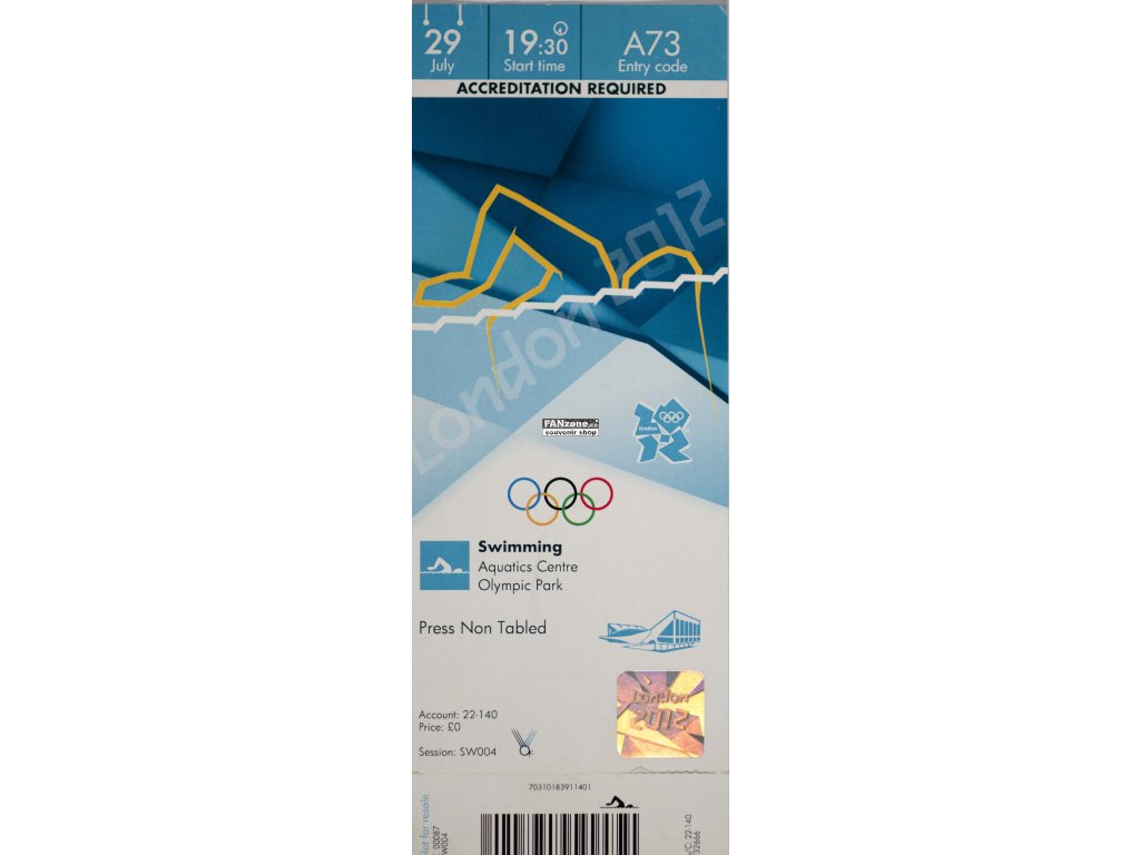 Autentická neutržená vstupenka na plavání z Olympijských her Londýn 2012 z 29. července 2012, Entry: A73, akreditační typ. Olympijské hry Londýn 2012 byly jednou z nejúspěšnějších olympiád v historii a plavecké soutěže patřily mezi nejsledovanější disciplíny. Aquatics Centre navržený Zahou Hadid byl jedním z architektonických skvostů her a hostil dramatické plavecké závody. 29. července 2012 byly na programu finálové závody včetně prestižních disciplín. Akreditační vstupenka A73 byla určena pro VIP osoby, novináře nebo olympijské funkcionáře. Neutržená vstupenka dokládá, že nebyla použita, což zvyšuje její sběratelskou hodnotu. Vzácná memorabilie pro sběratele olympijských vstupenek, fanoušky plavání nebo milovníky olympijské historie a londýnských her 2012