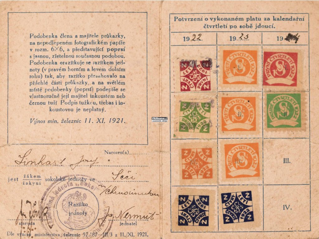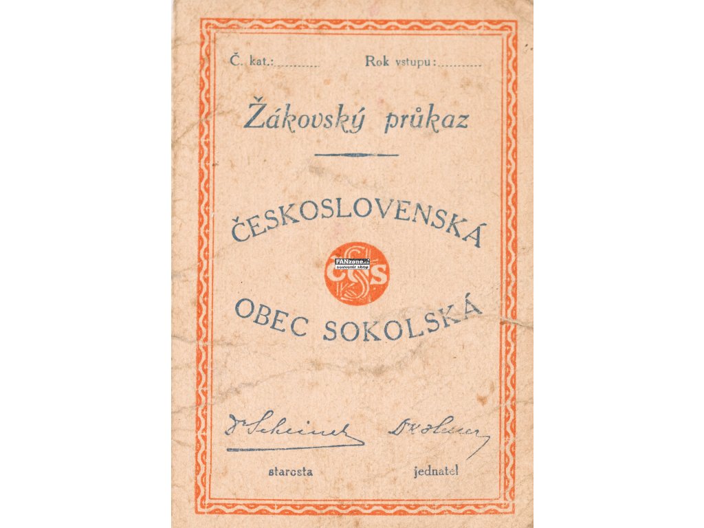 Historický žákovský průkaz Československé obce sokolské z období 1922-1924 se známkami, bez fotografie. Tento průkaz pochází z raného období první Československé republiky, kdy sokolské hnutí zažívalo velký rozmach po získání nezávislosti. Žákovský průkaz byl určen pro mladé členy sokolského hnutí, kteří se účastnili pravidelného cvičení a výchovy. Československá obec sokolská byla nejvyšší organizací sokolského hnutí, které mělo zásadní význam pro tělesnou a národní výchovu československé mládeže. Léta 1922-1924 byla obdobím budování nové republiky a konsolidace sokolského hnutí po první světové válce. Známky na průkazu dokládají platnost členství a účast na sokolských aktivitách. Průkaz bez fotografie byl standardním formátem pro mládežnické členství v tomto období. Vzácná memorabilie pro sběratele sokolských dokumentů, milovníky historie první republiky nebo zájemce o mládežnické sokolské hnutí dvacátých let.